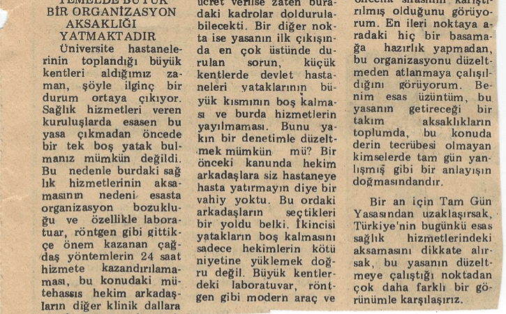 Üniversite hastanelerinin toplandığı büyük kentleri aldığımız zaman, şöyle ilginç bir durum ortaya çıkıyor. Sağlık hizmetleri veren kuruluşlarda esasen bu yasa çıkmadan öncede bir tek boş yatak bulmanız mümkün değildi. Bu nedenle buradaki sağlık hizmetlerinin aksamasının nedeni esasta organizasyon bozukluğu ve özellikle laboratuvar, röntgen gibi gittikçe önem kazanan çağdaş yöntemlerin 24 saat hizmete kazandırılamaması, bu konudaki mütehassıs hekim arkadaşların diğer klinik dallara oranla sayıca çok az olması Bu bakımdan günlük hizmette bir bekleme zamanının kaybolmasıyla ilişkili. Bu alt yapıyı düzeltmeden, bu kuruluşlara daha fazla vakit veren hekimleri doldurarak sağlık hizmetlerinin nasıl düzeleceğini anlamak mümkün değil. Hatta biraz ters bir etki de gösterecektir. Çünkü dışarda özel muayenehaneye müracaat ederek özel hastanelerde bakımı tercih eden kimseler şimdi tam gün nedeniyle hastanede kalan hekimlere muayene olmaya başlayacaklar, hastane içine müracaat artacak, belki de bu yasadan sonra tercihli hastaların yatma oranı artarak, daha önce özel muayenehaneye ekonomik nedenlerle gidemeyip hastaneye müracaat eden poliklinik hastalarının bu sağlık hizmetlerinden faydalanma oranı düşecektir.