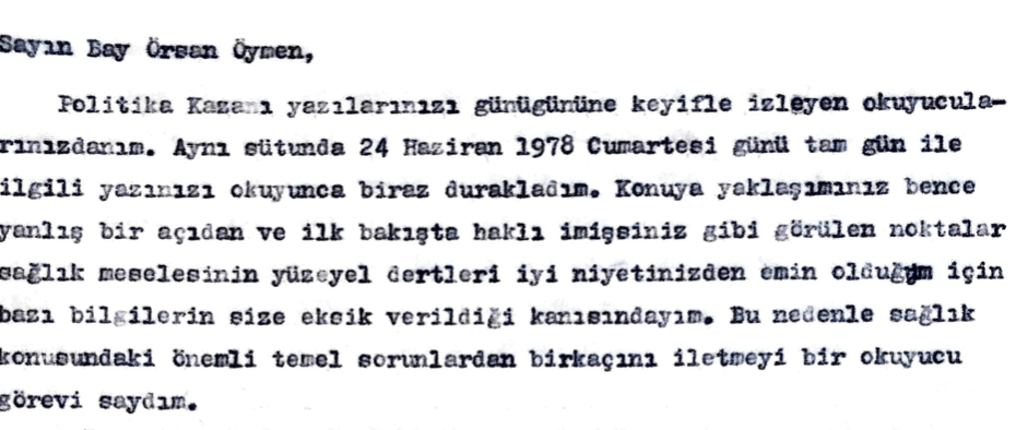 Politika Kazanı yazılarınızı günü gününe keyifle izleyen okuyucularınızdanım. Aynı sütunda 24 Haziran 1978 cumartesi günü tam gün ile ilgili yazınızı okuyunca biraz durakladım. Konuya yaklaşımınız bence yanlış bir açıdan ve ilk bakışta haklı imişsiniz gibi görülen noktalar sağlık meselesinin yüzeysel dertleri iyi niyetinizden emin olduğum için bazı bilgilerin size eksik verildiği kanısındayım, Bu nedenle sağlık konusundaki önemli temel sorunlardan birkaçını iletmeyi bir okuyucu görevi saydım.